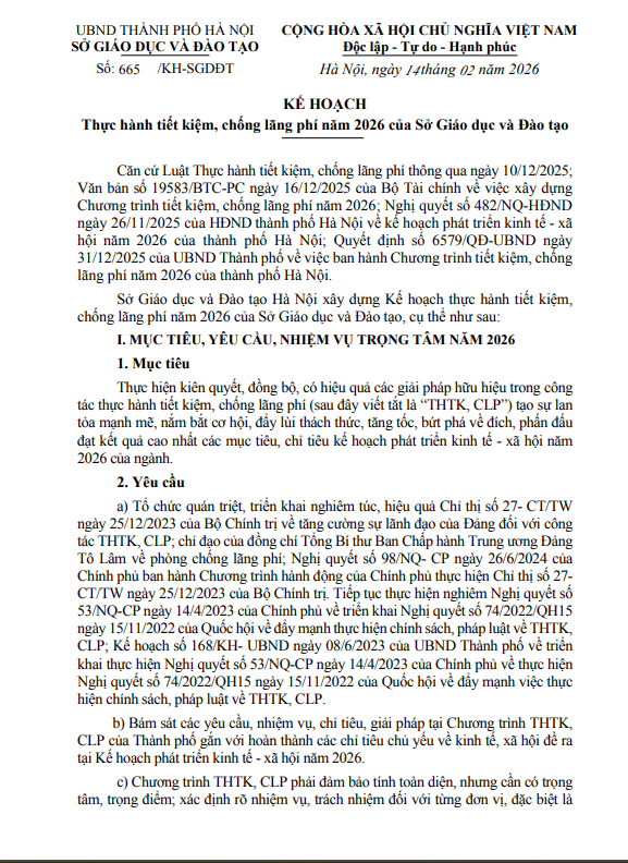 Thực hiện các văn bản chỉ đạo của cấp trên, Trung tâm GDNN- GDTX Cầu Giấy trân trọng thông báo về việc triển khai Kế hoạch thực hành tiết kiệm, chống lãng phí năm 2026 của Sở Giáo dục và Đào tạo, cụ thể như sau: